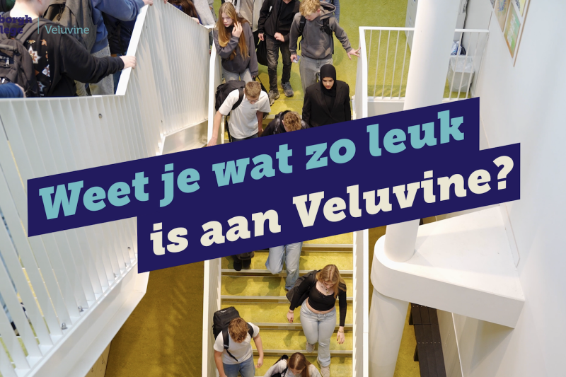Veluvine is een kleine middelbare school met plek voor alle tieners uit Nunspeet en omliggende dorpen, want we bieden voortgezet onderwijs op vele niveaus. Wat ons écht bijzonder maakt, is de kleinschaligheid: bij ons kent iedereen elkaar en voel je je gezien. Onze docenten en medewerkers zijn actief en betrokken en zorgen ervoor dat je je snel thuis voelt. Al onze docenten en ondersteuners zijn christen en dat merk je: we vinden aandacht voor de ander belangrijk en bouwen aan een veilige en vertrouwde sfeer. Iedereen mag er zijn en we zijn er voor elkaar. Dat versterken we door vier kenmerken waarmee wij er voor jou zijn.